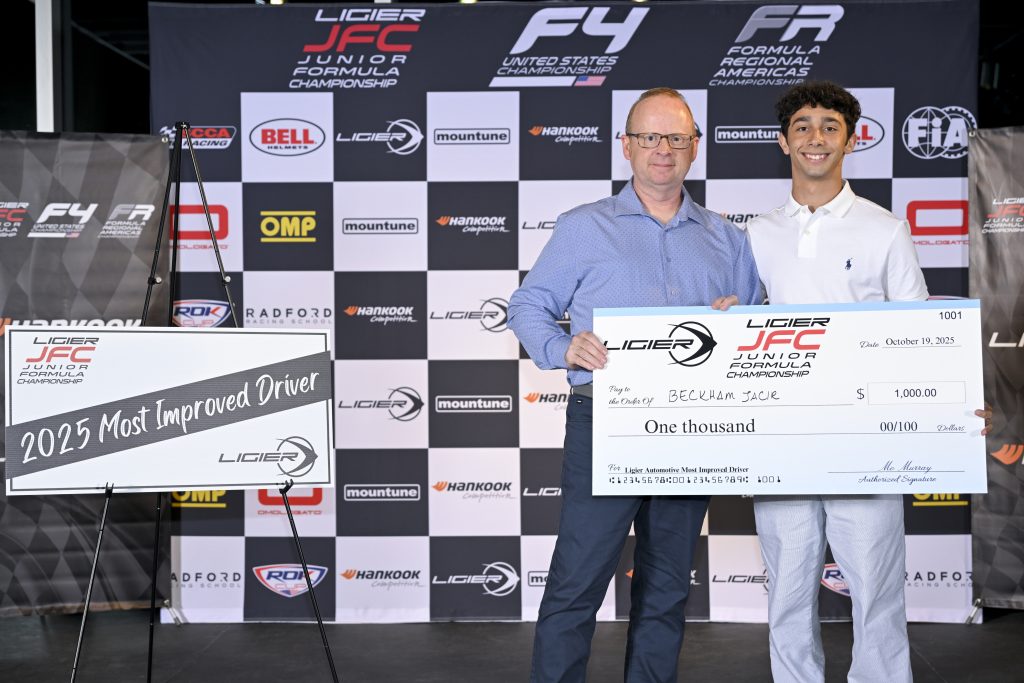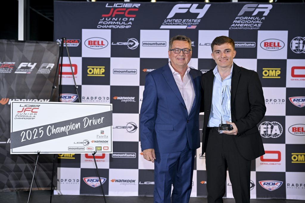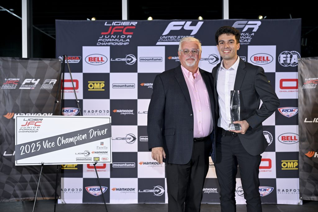 CHARLOTTE (December 29, 2025) – The Ligier Junior Formula Championship (Ligier JFC) once again proved to be an excellent training ground for young talent, providing drivers as young as 14 years old with the opportunity to get behind the wheel of a formula car and begin their racing careers. Attracting interest and participation around the globe, including drivers from four continents and nine countries in 2025, Ligier JFC welcomed seven drivers to Victory Lane, while nine different competitors finished on the podium this season. Leading the charge was Uruguayan Gastón Irazú, who was named the 2025 Driver Champion, and played a major role in his team, Champagne Racing, earning the 2025 Team Championship title. Drew Szuch was back for a second season taking the Vice Championship, while rookie Cash Felber finished the year as the Third-Place Champion. Beckham Jacir, another rookie, was recognized as the Ligier Most Improved Driver, while the youngest driver in the field, Max Mokarem, earned the Omologato Perfectly Timed Pass Award.